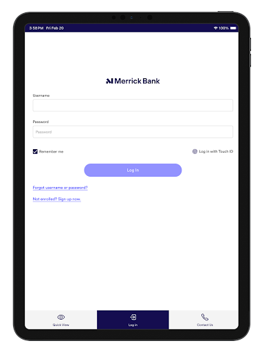 To log in, open the Merrick Bank Mobile app on your Android device and enter your user credentials. You'll need your username and password, which you set up during account registration.